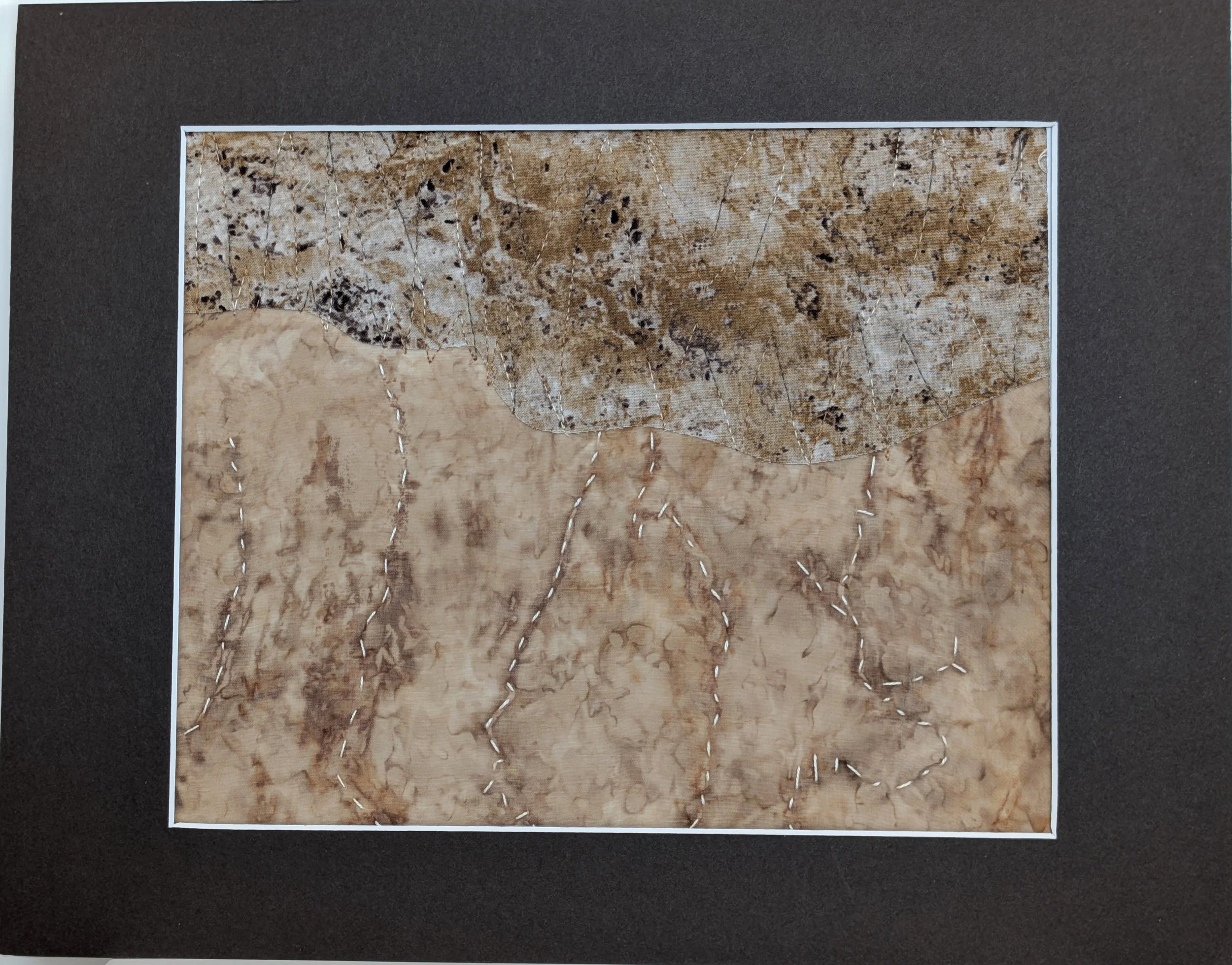 Rusting is used in some pieces and walnut ink applied over the rust to create rich visual texture and depth of color. The wall art utilized commercially produced batik fabrics for their variety and depth of color. Natural fabrics of linen, cotton or silk are also used, selected for their color and texture. Some fabrics are over-dyed with coffee that is allowed to evaporate in the desert heat, leaving darker places where the coffee has pooled.